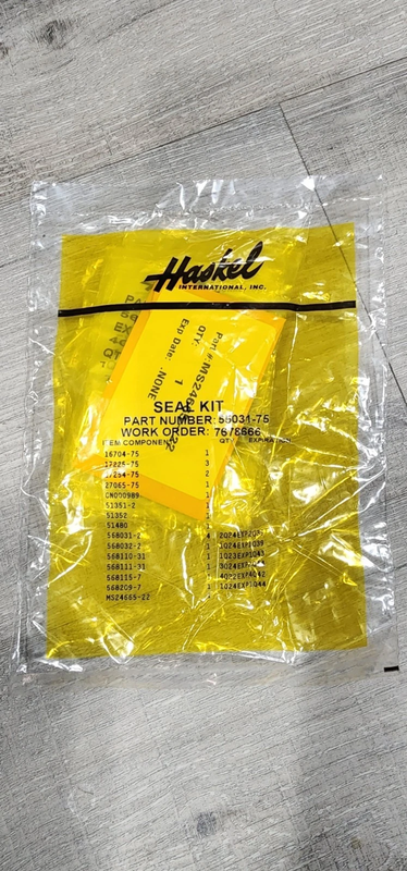 The Haskel 55031-75 seal kit is designed for gas section piston maintenance in Haskel gas boosters (e.g., the 59025 series). It contains OEM precision seals and backup rings to ensure leak-free gas operation under high pressure. Ideal for hydrostatic testing, chemical injection, or industrial gas systems, the kit simplifies pump rebuilds and enhances reliability. Packaged in sealed, labeled bags, it aids in inventory control and workshop efficiency.