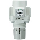 This modular air regulator is designed to maintain consistent air pressure in pneumatic systems. It features a downward adjustment knob, embedded square pressure gauge with a limit indicator, and supports a set pressure range of 7125 psi. The unit is compact yet rugged, ideal for high-performance industrial use. Its lockable design prevents accidental setting changes, and it integrates easily with other FRL components.