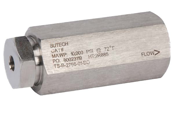 The Butech Pressure Systems O-Ring Check Valve, identified by Item Id FPSC4, is a high-performance valve designed for demanding industrial applications. This check valve features a female-to-female (FxF) connection and is rated for pressures up to 15,000 psi, making it suitable for high-pressure systems. With a 1/4" FNPT connection, it ensures secure and reliable sealing, preventing backflow in fluid systems. The valve is engineered for durability and efficiency, providing long-lasting performance in various industrial environments. Its compact design allows for easy installation and maintenance.