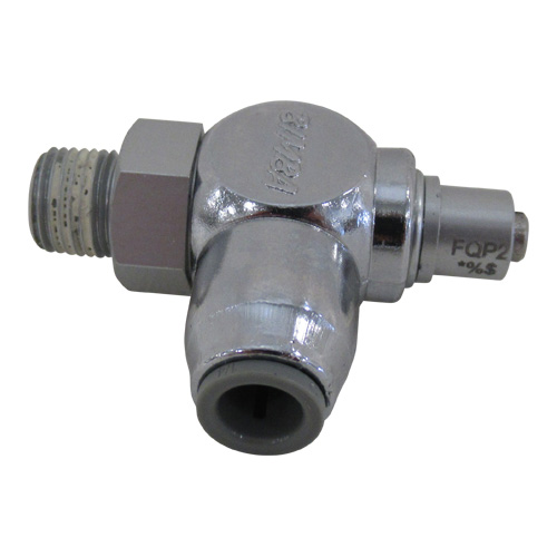 The Bimba FQP2 is a compact Quik-Flo flow control valve designed for meter-out control in pneumatic cylinders. It features a 1/8" NPT inlet and 1/4" push-to-connect tube outlet, with a recessed screwdriver adjustment for fine-tuning. Constructed from durable metal, it offers precise speed control in industrial automation applications. Its design ensures free flow in one direction and controlled flow in the other, making it ideal for managing exhaust flow in compact cylinder setups.