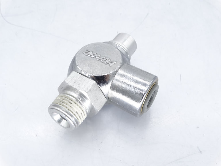 The Bimba FQP6 Quik-Flo is a compact flow control valve designed to meter exhaust flow (meter-out) from pneumatic cylinders. It features a 3/8" NPT inlet and 3/8" push-to-connect tube outlet, with a recessed screw adjustment for fine flow control. Chrome-plated zinc alloy construction ensures corrosion resistance and durability. The valve delivers controlled flow in one direction while allowing free flow in the opposite direction, offering a balanced Cv of ~0.73 (controlled) and ~0.91 (free). Ideal for precision speed control in industrial automation and tooling systems.